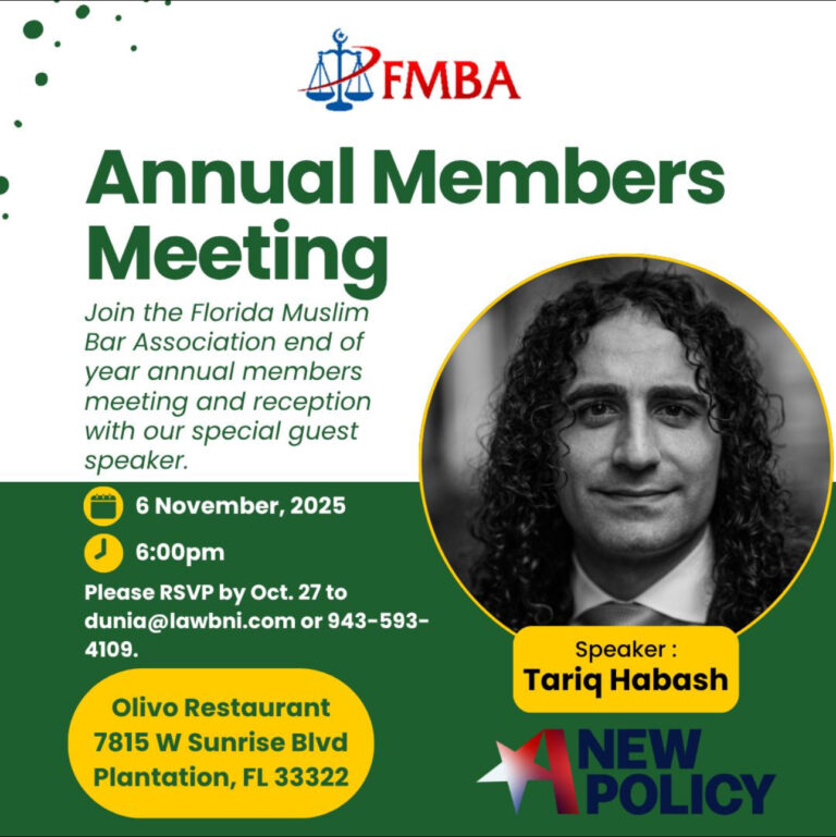 August 22nd 2024 6PM – 8PM 1901 N Federal Highway6PM – 8PMPompano Beach, FL 33062Please join the Florida Muslim Bar Association andthe Palestinian American Bar